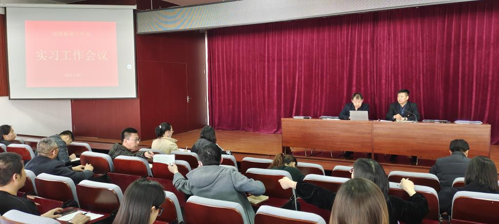 道路桥梁工程系学生岗位实习工作会议于2023年3月20日下午4点30分在三号教学楼阶梯教室召开。出席此次会议的领导和老师有:道路桥梁工程系党总支副书记安希杰、副主任常志航、教务科科长张晓鹏、铁道教研室主任韩青松、道桥教研室主任张文华及全系教师。本次会议由实训科科长张振老师主持。