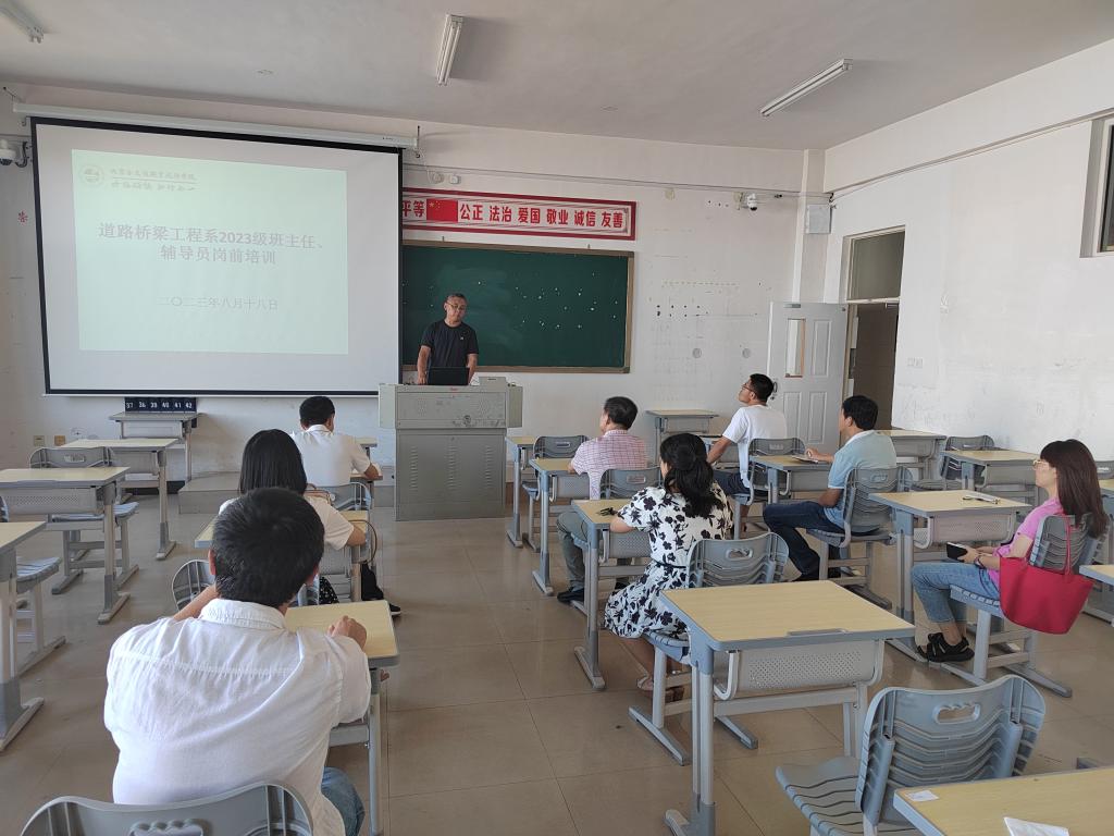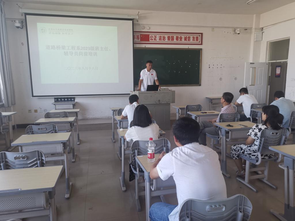 为进一步加强辅导员、班主任队伍建设,提高辅导员班主任的综合素质和业务能力,8月18日上午,我系在承远楼3楼307召开辅导员班主任岗前培训,培训由道路桥梁工程系副主任常志航主持、学生科科长格日乐图做专题报告。全系2023级全体辅导员、班主任参加本次培训。