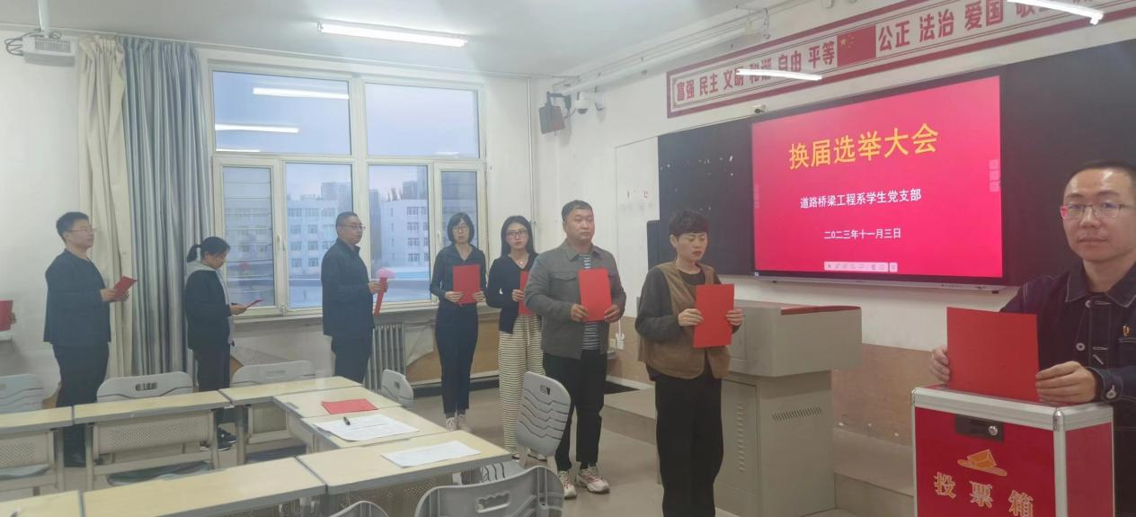 11月3日下午,道路桥梁工程系学生党支部召开了换届选举大会,选举产生新一届党支部委员。道路桥梁工程系党总支副书记格日乐图主持换届选举工作,全体党员参加。