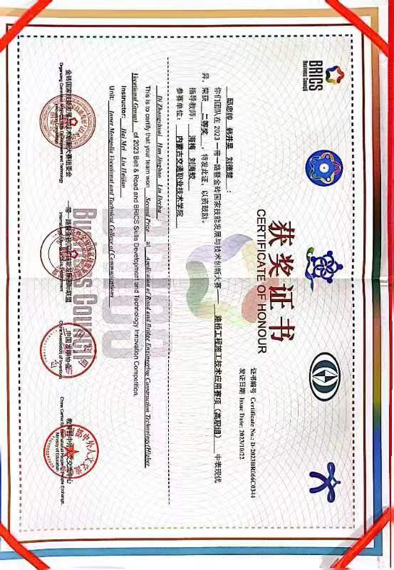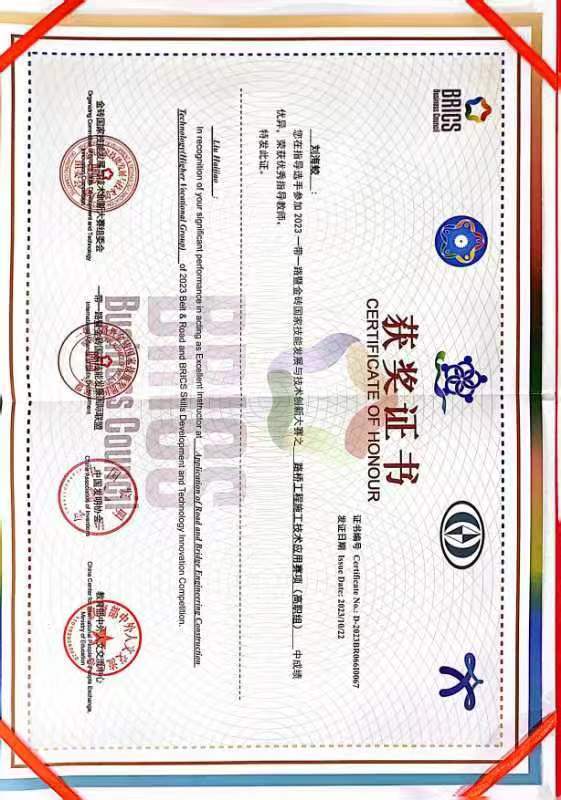 10月22日,2023第七届一带一路暨金砖国家技能发展与技术创新大赛-路桥工程施工技术应用技能竞赛全国总决赛闭幕,铁道教研室学生团队邸忠帅、韩井昊、刘德楚(指导教师海梅、刘海蛟)和学生团队魏亚航、赵芷沅、付善允(指导教师常志航、于海涛)分别获得高职组二等奖、三等奖,海梅、刘海蛟获得高职组优秀指导教师奖。
