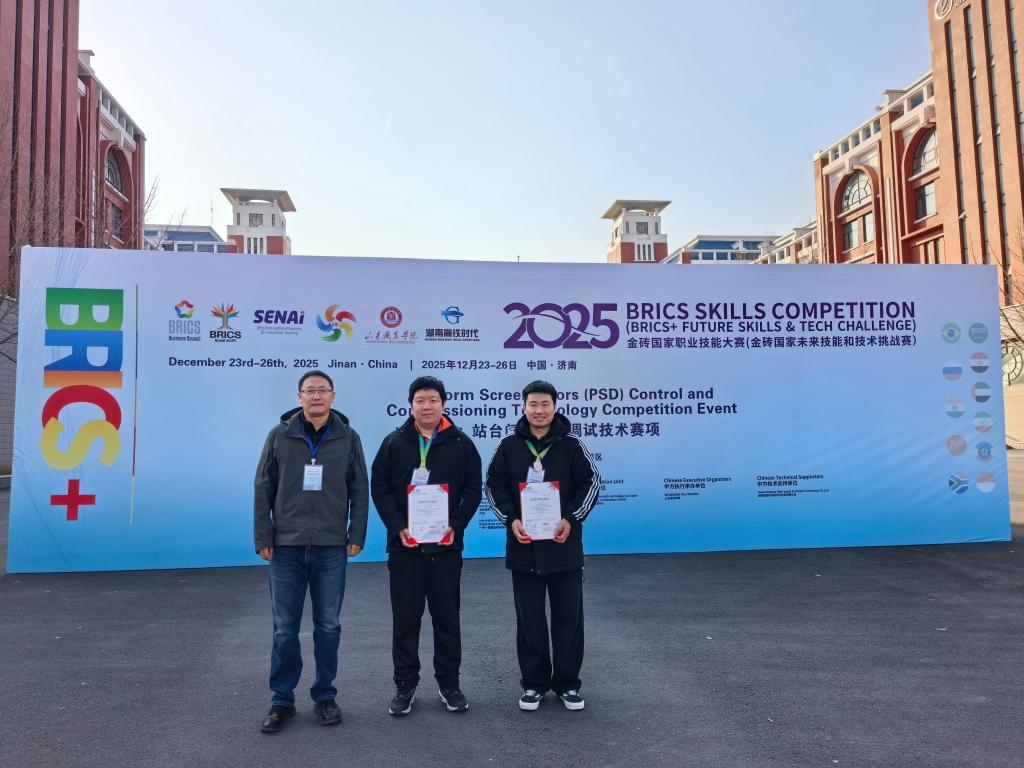 12月26日,2025金砖国家职业技能大赛(金砖国家未来技能和技术挑战赛)站台门控制与调试技术赛项国际总决赛,在山东省济南市山东职业学院圆满落幕。内蒙古交通职业技术学院王俊博、李海超教师团队,在该赛项中斩获国际总决赛一等奖,指导教师李媛婧、衡丽娜获得优秀指导专家称号。赛事聚焦城市轨道交通运营管理职业能力培养,考点涵盖地铁站台门巡检、电气系统控制原理、故障检修等作业流程,全程历时六小时,全面考察参赛选手...