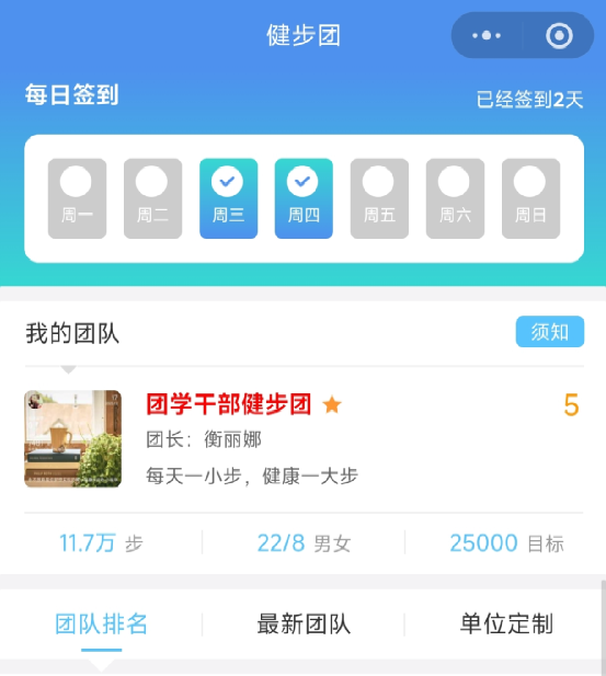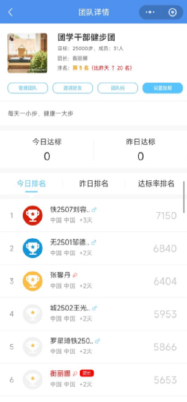 随后,衡老师现场演示并指导大家使用“小步运动”小程序,创建了“团学干部健步团”。该团队由22名男生与8名女生共同组成,设置每日运动目标,并学习打卡记录、活动创建、公益捐步等功能。首日活动中,团长设定团队目标为5000步/人,激发了成员的参与热情。