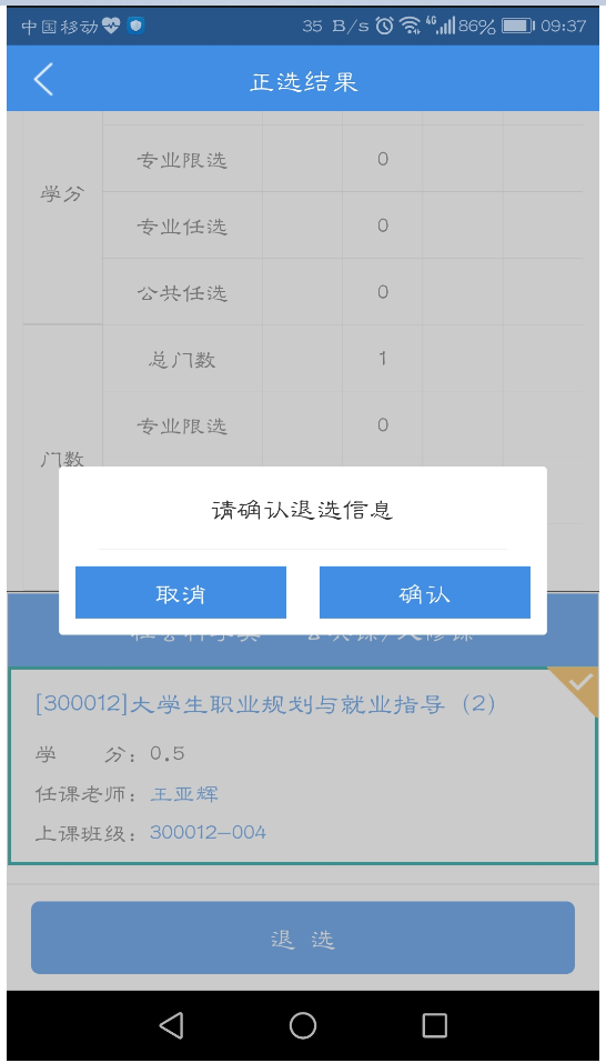 如果需要退选已经选过的课程,点击退选按钮,点击确定即可,如图8所示: