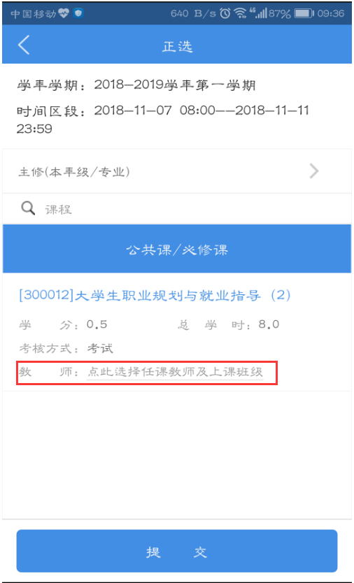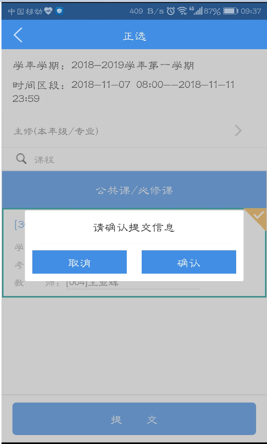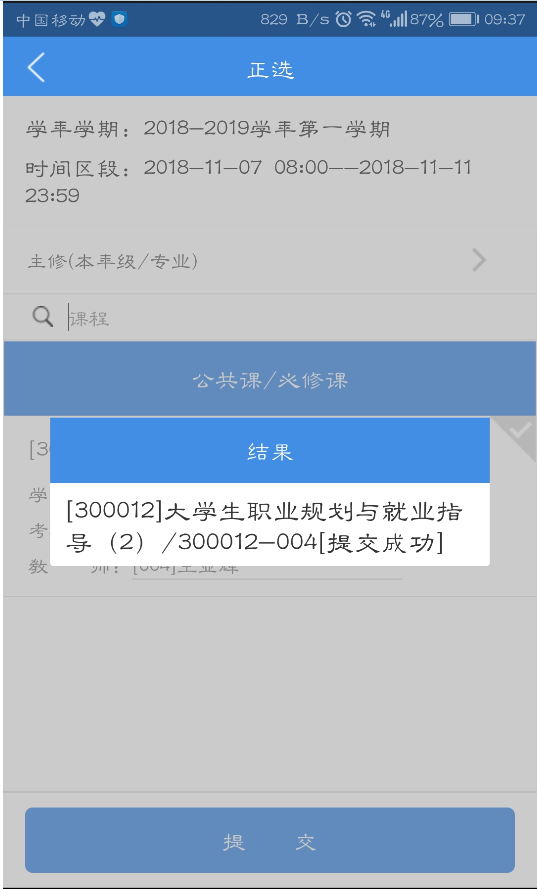 点击课程信息后面选择按钮,弹出该课程开设的上课班级的信息,选择合适的该课程的上课班级,点击提交即可,如图5所示:
