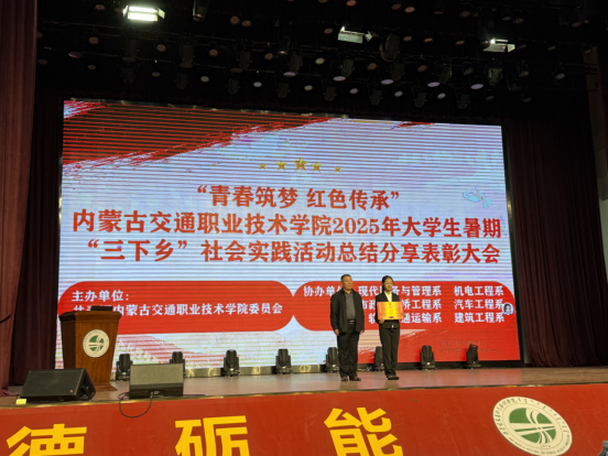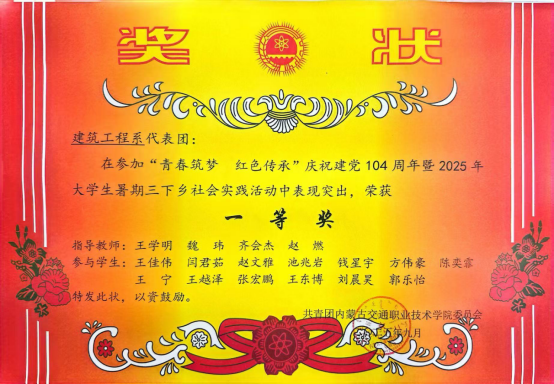 近日,在学院暑期社会实践总结表彰大会上,建筑工程系赴赤峰市红山区文钟镇柳条沟村“三下乡”社会实践团队凭借其扎实的工作、显著的成效和深远的社会影响,从众多团队中脱颖而出,荣获一等奖殊荣。这份荣誉,是对建工学子深入基层、服务乡村、锤炼本领的充分肯定,也凝聚了全体实践队员在炎炎夏日挥洒汗水、奉献智慧的青春力量。