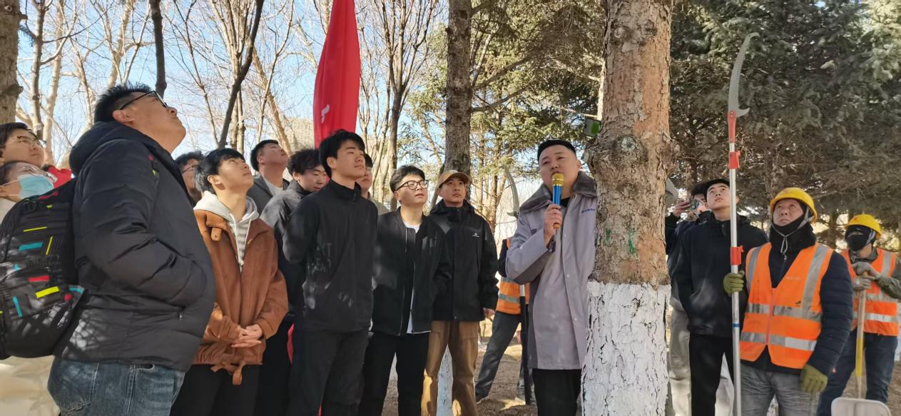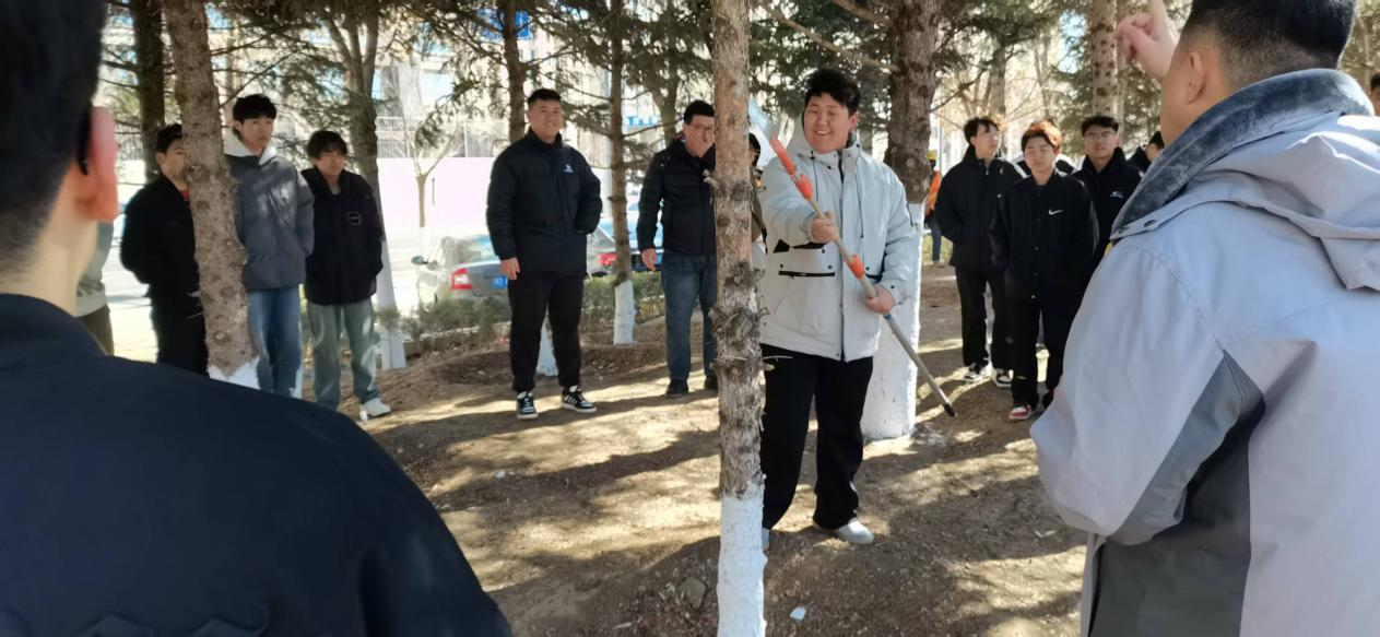 “这棵乔木的修剪要记住一平二静-剪口平齐防感染,枝干径直保树形…”。园林绿化所闫所长手持修枝剪,在园林乔木前开启“微党课”。他不仅追溯了植树节的起源,还梳理了其从创立之初到新时代“绿水青山”理念的历史脉络。更结合赤峰市“三北防护林”建设案例,为师生拆解“一平、二静、三清、四空、五密”的修剪口诀。当讲到“三清”(清病虫枝、清交叉枝、清重叠枝)时,他特意举起一段修剪下的病枝:这就是树木的“健康体检”,市政养护人要做城市森林的“全科医生”。
