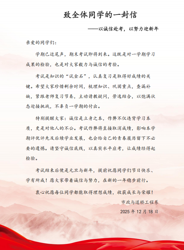 根据教学工作计划安排,我系2025年12月22日—25日组织进行2025-2026学年第一学期专业课期末考试,系部对此次考试非常重视,考试前召开期末考试考务工作会议,给每一名学生转发了《致全体同学的一封信--以诚信赴考,以努力迎新年》,要求监考老师在考试期间认真履行监考职责,严格按照考试考务工作流程组织考试,并严抓考场纪律,杜绝作弊行为的发生,保证考试的公平公正,确保每一位学生有一个良好的考试环境。
