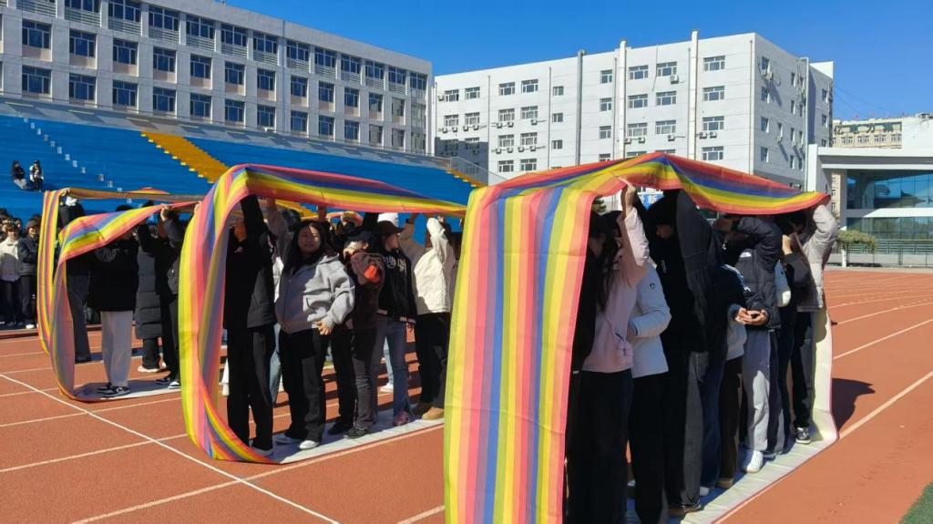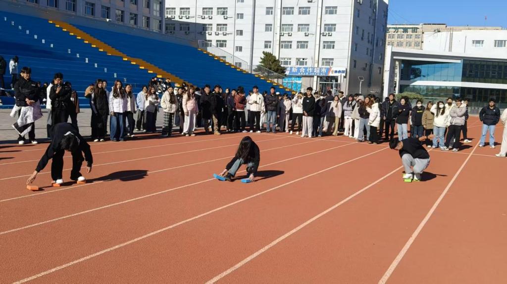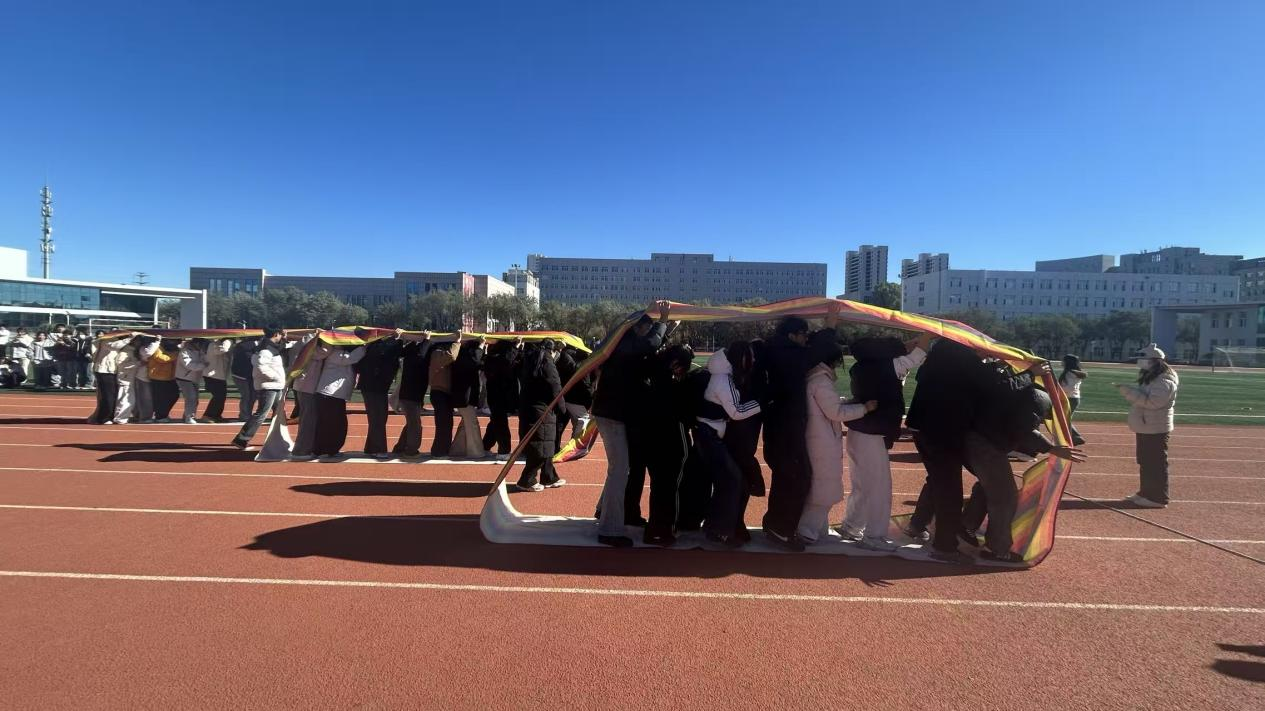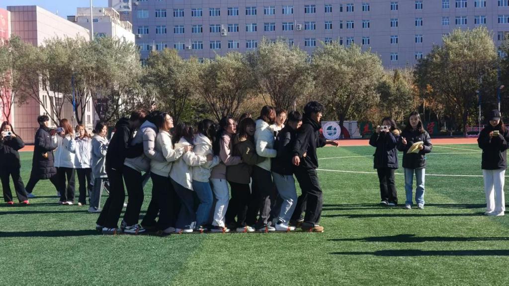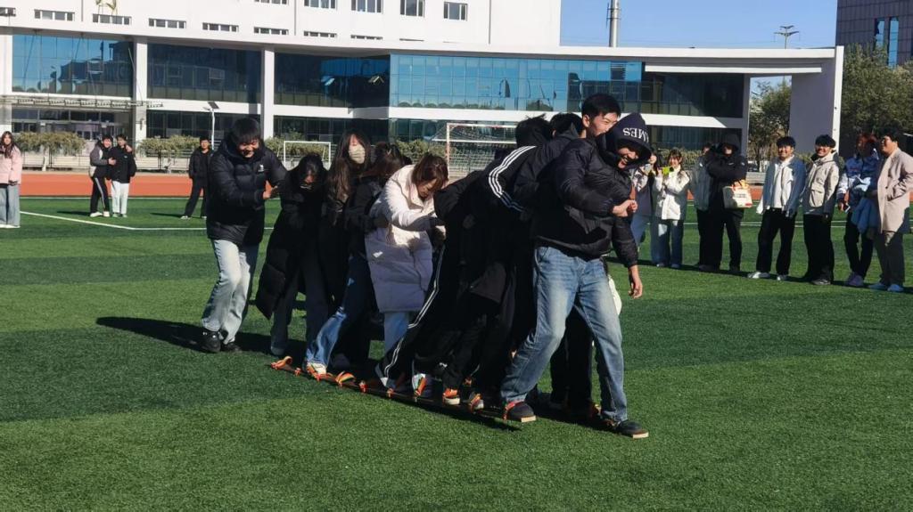 紧接着是无敌风火轮,辅导员和班级学生齐上阵,大家站上圆环“履带”,齐心协力、步调一致地向前滚动。比赛中不时有队伍因脚步不齐而“卡壳”,但队员们迅速调整、默契配合,展现了出色的团队协作能力。