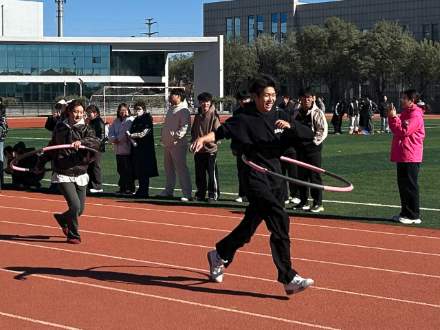 呼啦圈竞走作为开场项目,瞬间点燃了赛场热情。每班6名队员在30米赛道上边转呼啦圈边奔跑,既要保持速度,又要稳住呼啦圈不落地。队员们个个身手敏捷,圈随人转,人随圈动,场面既紧张又充满趣味。