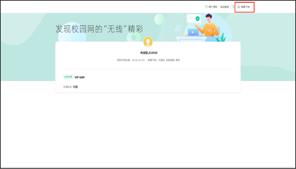 3、如需断开连接,可在认证页面点击"下线",部分设备断开Wi-Fi 连接后会自动下线。