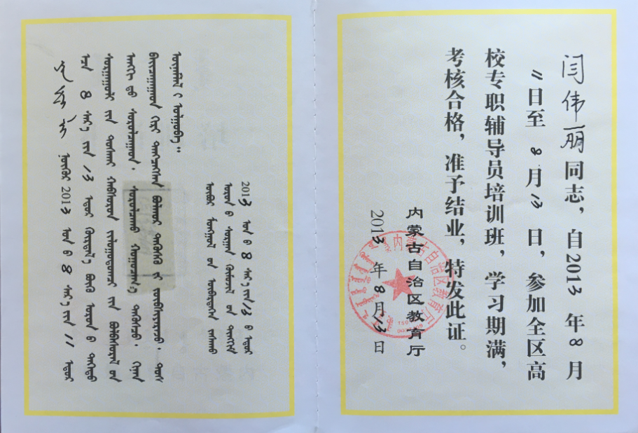 2012年10月,被评为内蒙古自治区“优秀教师”。
