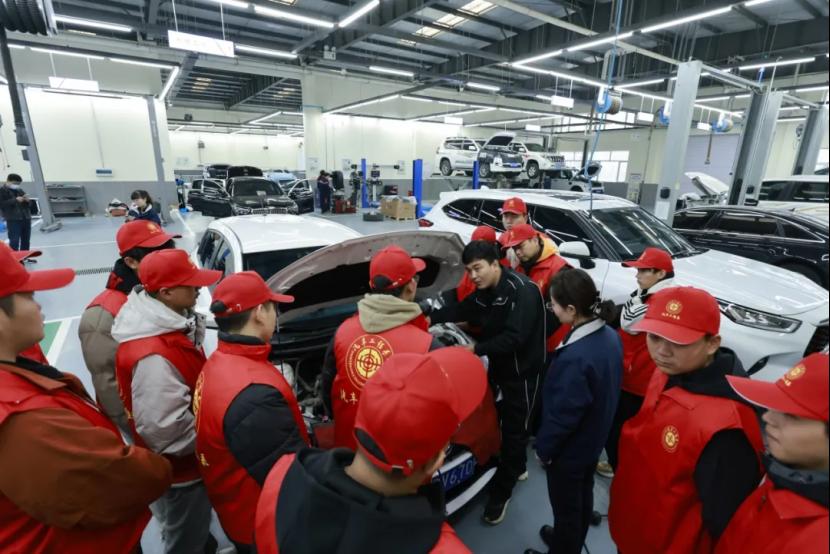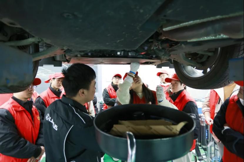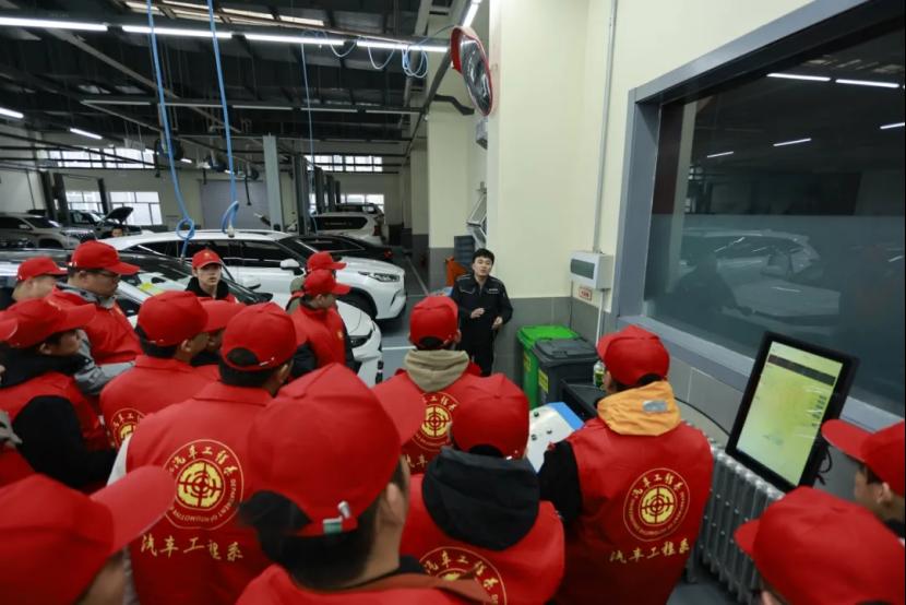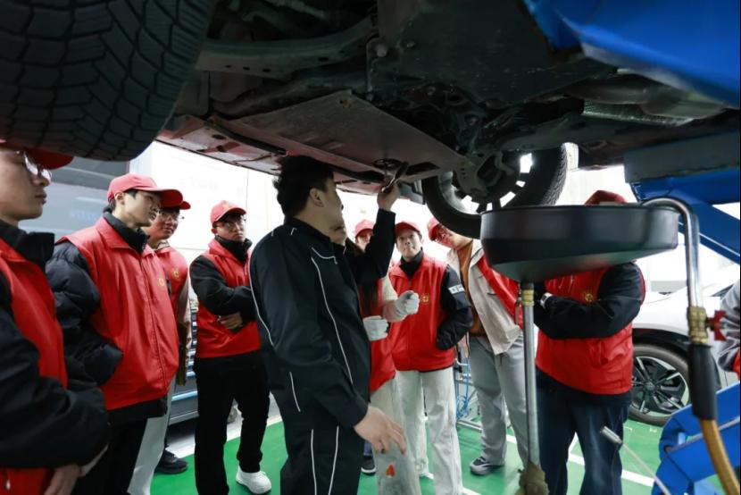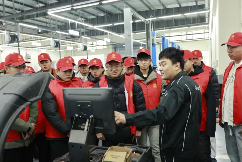 同学们还实地观摩、体验了售后车间各个维修工位的操作流程。在快速保养工位,大家了解了可视化维修系统及其标准化作业流程;在工具认知与故障诊断实践环节,大家动手操作车辆故障检测系统,增强了故障诊断的实战经验与实践能力。