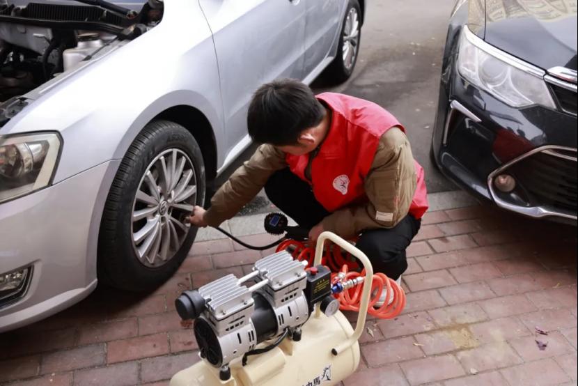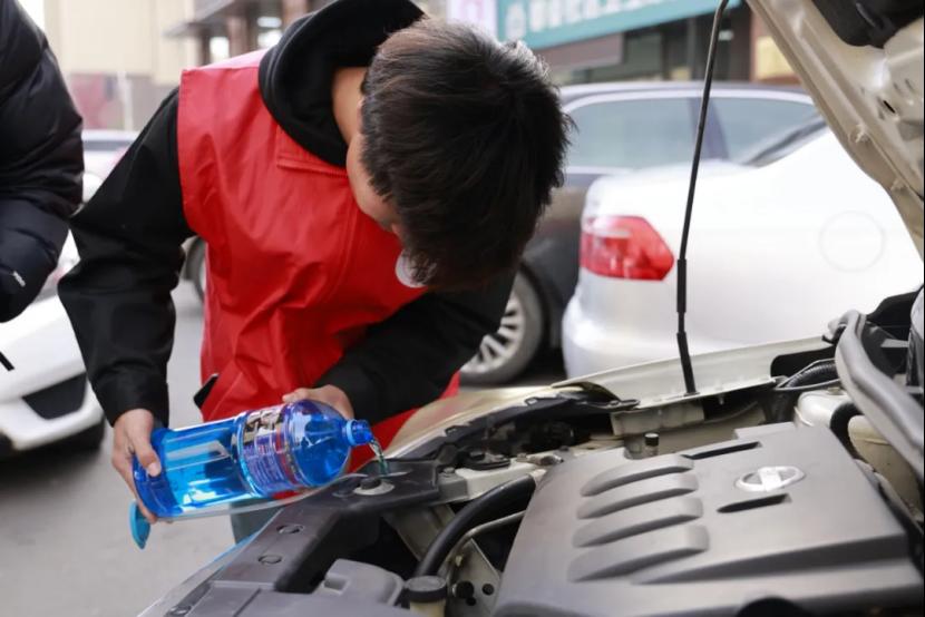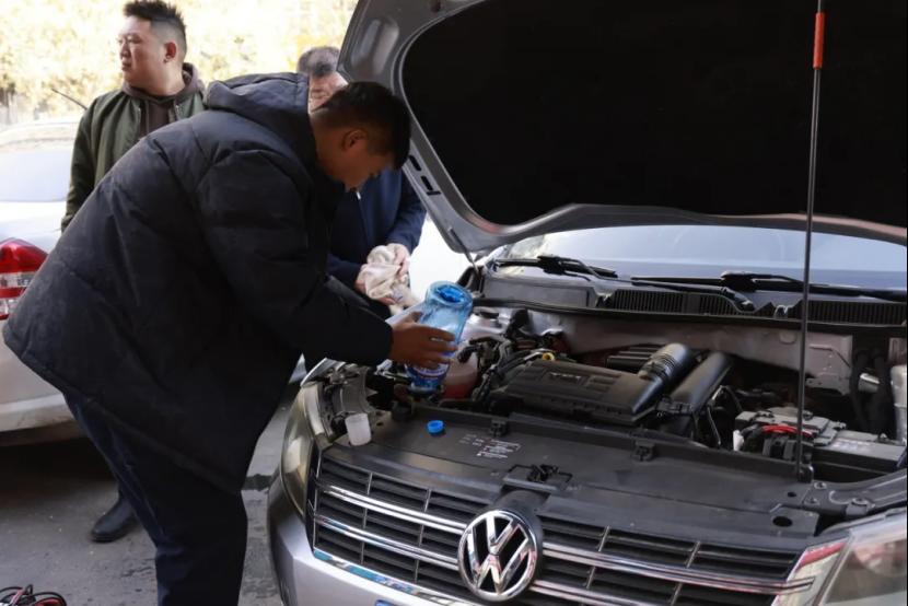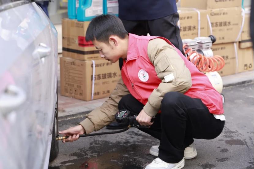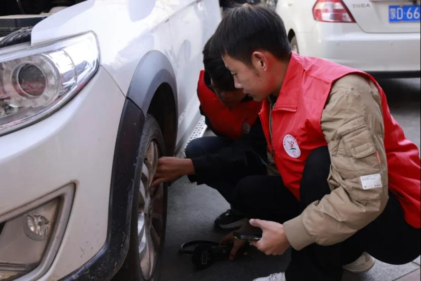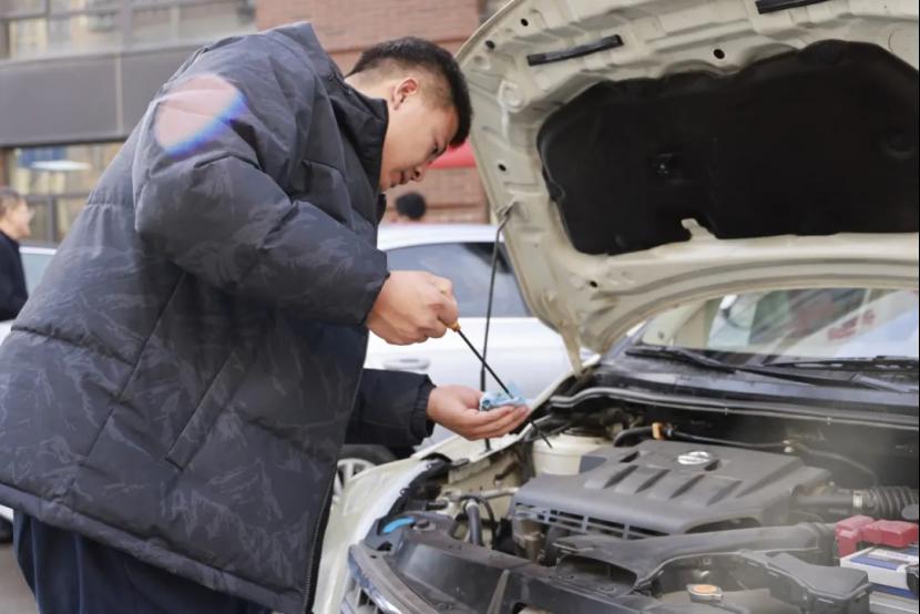 活动当天,都会社区的门前设置了检测工位,汽车工程系的师生们携带专业检测设备,对居民车辆的刹车系统、轮胎磨损程度及机油液位与油质等情况进行了排查检测,并免费为车辆补充了玻璃水、冷却液。检测结束后,师生们还为居民出具了简易版《车辆检测报告》,标注了车辆状态和注意事项。