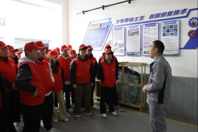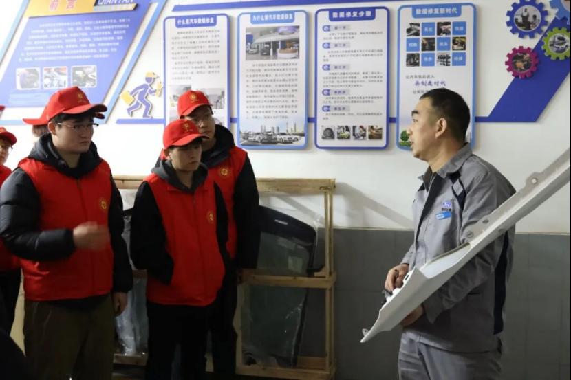 在钣金车间,技术人员凭借精湛的技艺上演了“化腐朽为神奇”的修复操作:车身凹陷修复、零部件整形等工序一气呵成,受损部件快速恢复原貌,让同学们对汽车结构修复、材料性能应用有了全新的认知。